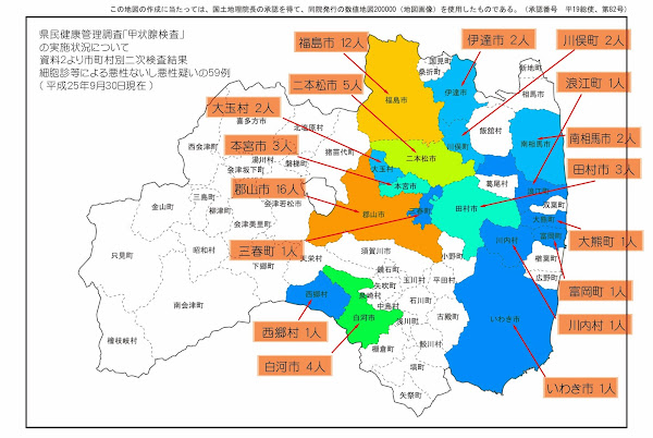 2013年11月12日に開催された福島県「県民健康管理調査」検討委員会での配布資料(甲状腺検査)から市町村別二次検査結果で出た悪性ないし悪性疑いの59例を市町村別に福島県の地図(フリー素材)に書きこんでみました。