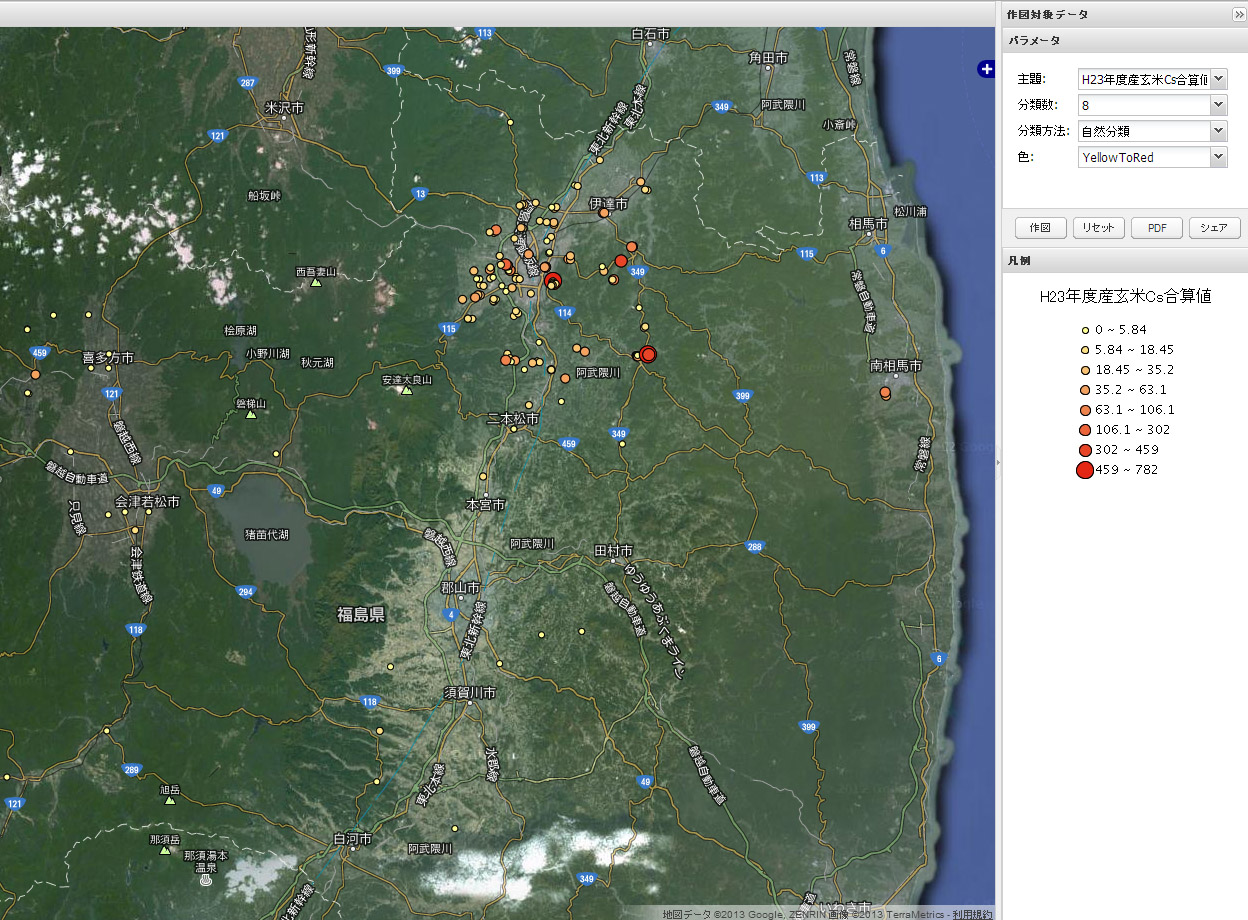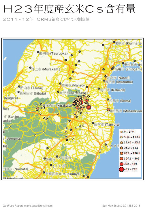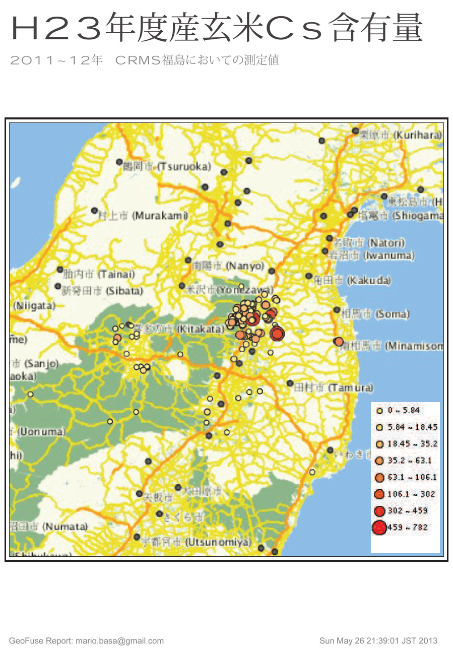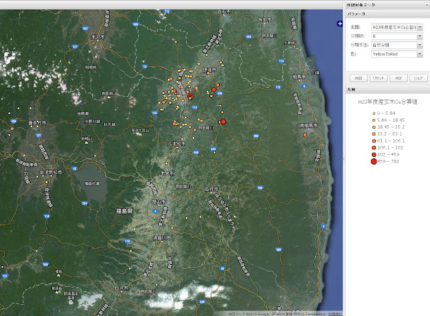 ここ のサイトの「空白のストロンチウム89汚染地図(米国DOE/NNSA土壌調査)」で紹介されている「GeoFuse」で試しにH23年度産玄米のCs含有量マップを作りました。