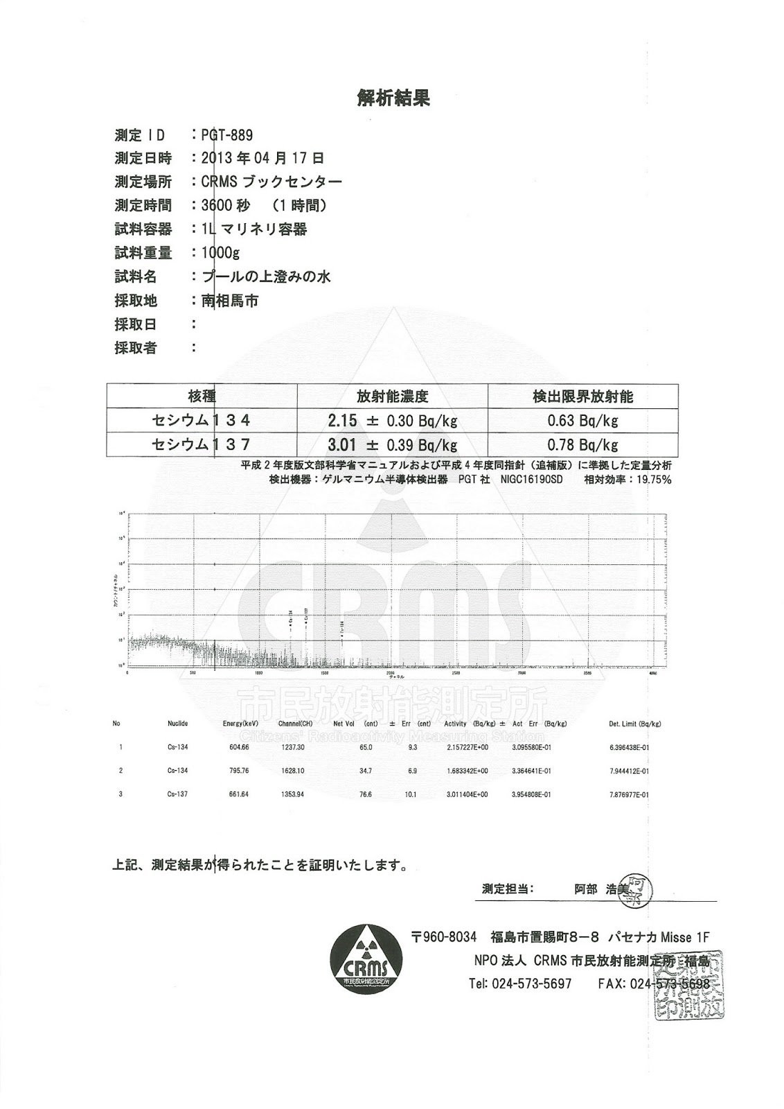今回、朝日新聞の依頼という事でプールの汚泥及び水を測定しましたが、まさかCsがここまで濃縮されているとは思いませんでした。