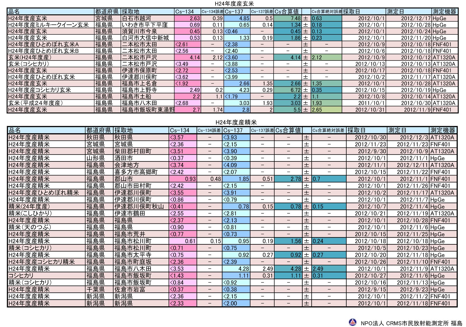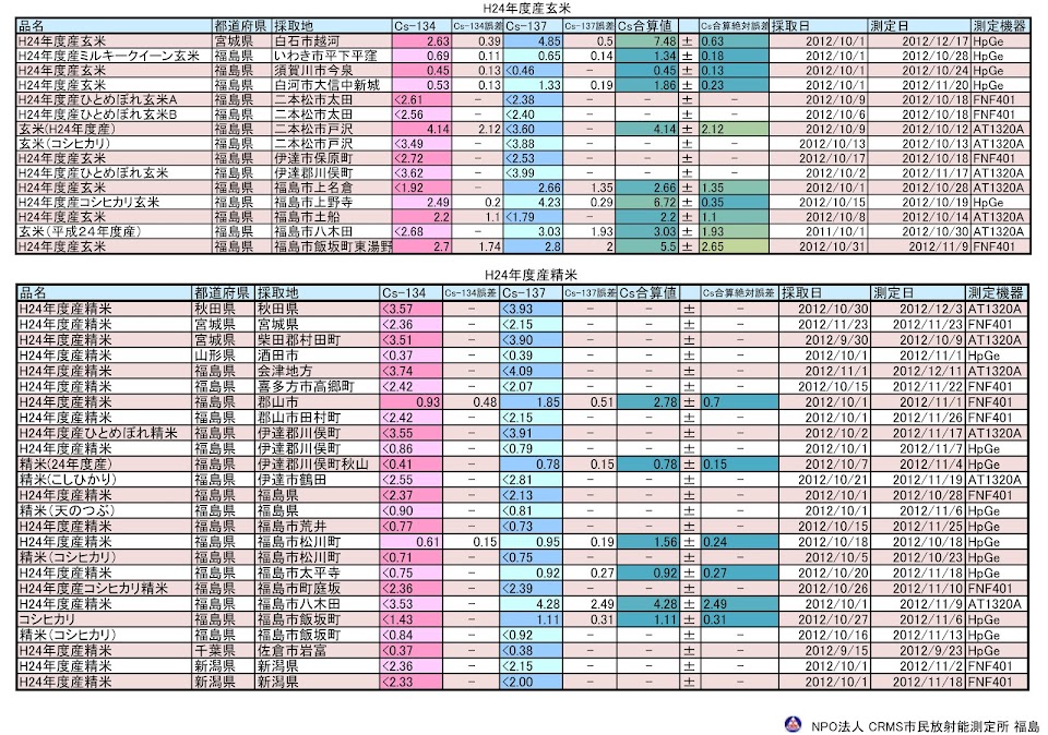 年明け1月から福島市内の学校給食用の米が市内産に切り替わるそうです。全袋検査を含めて5回測定するという事ですが検出限界Cs合算20Bq/kgで3回測定、Cs合算10Bq/kgで1回測定という事です。上の図はCRMS福島で測定した今年度産の玄米、精米の測定値です。昨年に比べるとJAや行政の検査体制が整った為ここでの測定数が10分の一近くに減っていますので福島市全域のデータとなっていません。ごく一部の参考例と見てもらうしかありませんが、合算20Bq/kg以下でもこれくらいは含有しているというのはわかると思います。これを高いとみるか低いとみるかはそれぞれですが、ND(不検出)というのは「0」では無いという事はわかると思います。そして合算19Bq/kgと合算2Bq/kgでは開きがあります。お米は主食であり、食べる量は他の食材とは違います。 同じ合算20Bq/kgでも、食べ盛りでご飯を一日500g以上食べていれば半分の10Bq/kgを体内に取り込む事になります。白菜やホウレンソウが同じ合算20Bq/kgだとしても食べる量はご飯には到底及びませんので、それら副食とは別と考えるべきです。せめて主食については水と同じ基準にすべきと個人的には思いますし、今回の給食用のお米にしても給食センターで使用する測定器「AT1320A」であれば検出限界以下の数値も参考値として出すのですから、検出限界以下の中でも出来るだけ低い物を提供すべきではないでしょうか?。 最後にICRPが出している体内に取り込まれたCsがどのように蓄積していくか、排出されていくかの資料を上げておきます。
