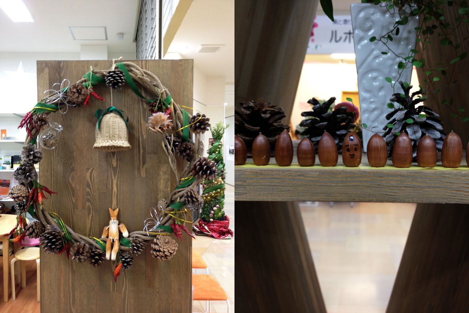 例年、この季節は子供たちが落ち葉、松ぼっくりやどんぐりを拾って、それらを使いおもちゃや人形を作って遊んだりしています。