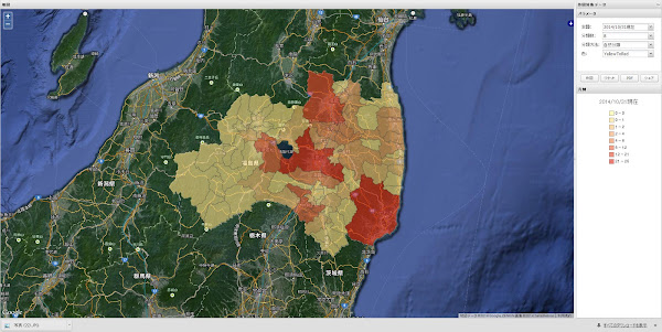 県民健康調査「甲状腺検査」の市町村別悪性ないし悪性疑い結果を時系列で見れるように「GeoFUSE」を利用してマップを作成しました。