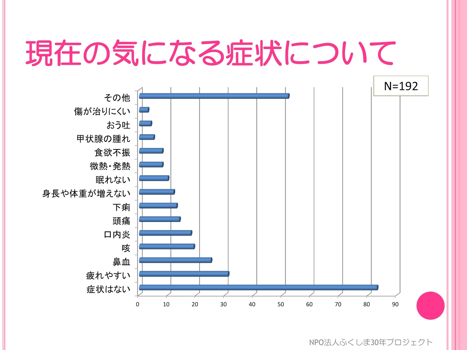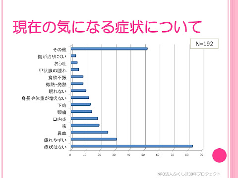 子どもの体調が悪いと、つい、放射能の影響と結びつけて考えてしまいがちとなり、不安を口にすると、「風評被害をあおっている」など、非難される雰囲気があり、「相手の顔色をうかがいながらしか、放射能の話しができない」状態があります。子どもの健康を心配する親たちは、相談できる相手もいないまま、周囲との摩擦を感じる生活が続いています。