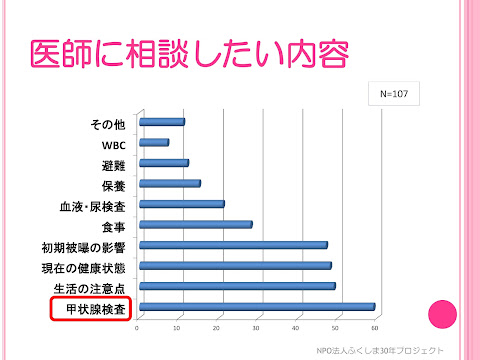 福島県が行っている甲状腺検診では甲状腺がんの疑いも含めて平成26 年3 月31 日現在 89名の異常者が出ています。身近に手術を受ける子供が出現していることで、子を持つ親は、福島に居てよいのか避難すべきか再び悩み動揺しています。