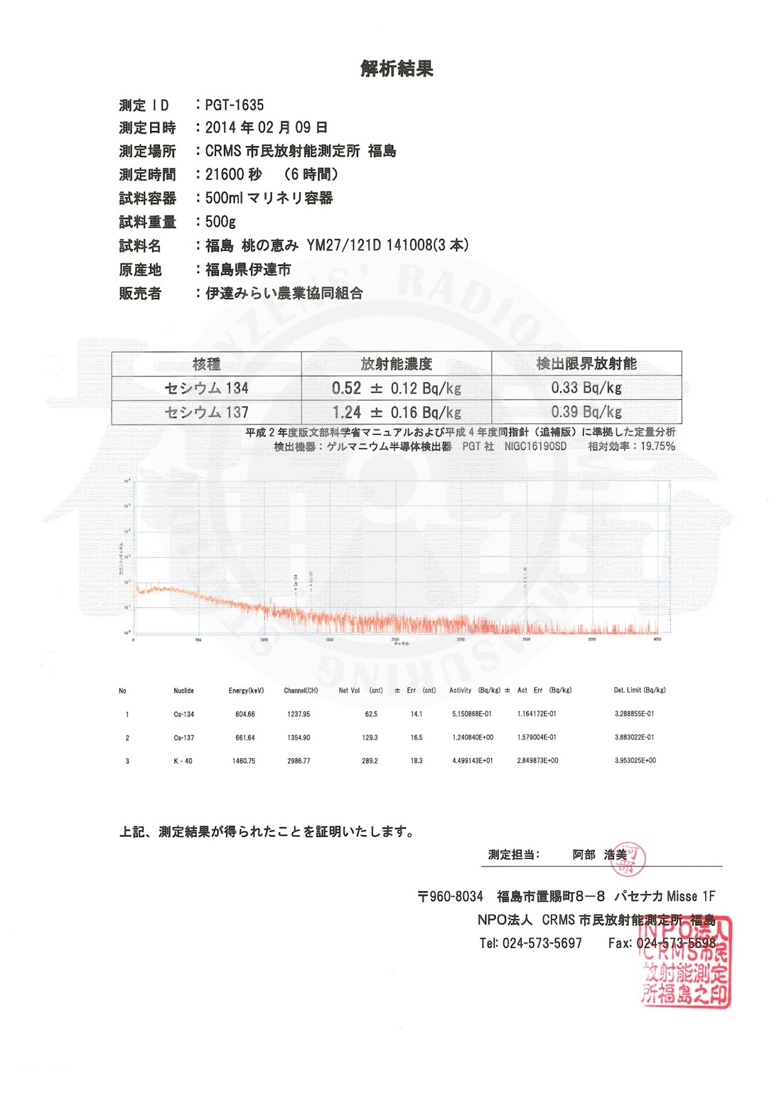 今まで継続的に測定してきた桃のストレートジュース「桃の恵み」。これは福島県伊達市周辺の桃を使用して作られ、JA伊達みらいが販売しています。